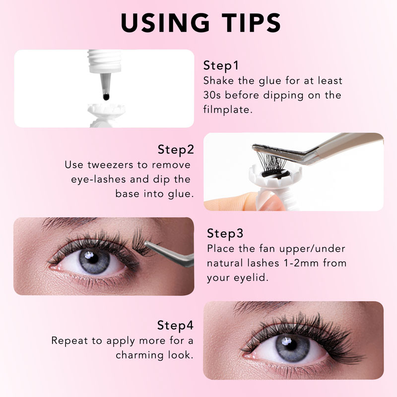 Başvuru süreci hızlı ve kolaydır. İstediğiniz kirpik kümelerini seçerek ve düz bir yüzeye koyarak başlayın. Ardından, her kümenin tabanına az miktarda DIY kirpik küme tutkalını uygulayın. DIY kirpik küme tutkalının birkaç saniye kurumasına izin verin ve kümeleri nazikçe doğal kirpiklerinize bastırın.